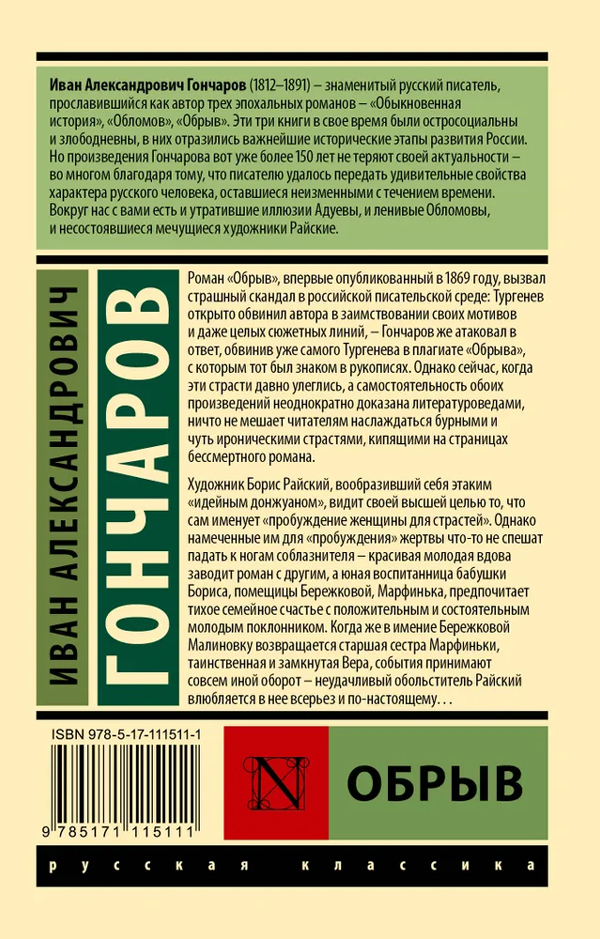 Роман "Обрыв", впервые опубликованный в 1869 году, вызвал страшный скандал в российской писательской среде: Тургенев открыто обвинил автора в заимствовании своих мотивов и даже целых сюжетных линий, — Гончаров же атаковал в ответ, обвинив уже самого Тургенева в плагиате "Обрыва", с которым тот был знаком в рукописях. Однако сейчас, когда эти страсти давно улеглись, а самостоятельность обоих произведений неоднократно доказана литературоведами, ничто не мешает читателям наслаждаться бурными и чуть ироническими страстями, кипящими на страницах бессмертного романа.