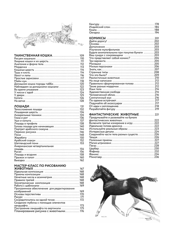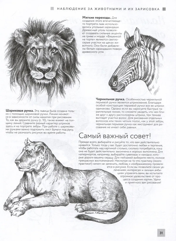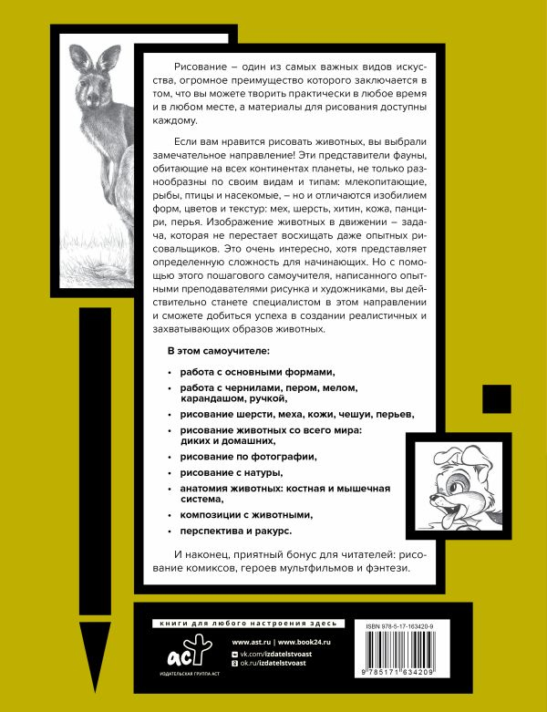 Если вам нравится рисовать животных, вы выбрали замечательное направление! Эти представители фауны, обитающие на всех континентах планеты не только разнообразны по своим видам и типам: млекопитающие, рыбы, птицы и насекомые, – но и отличаются изобилием форм, цветов и текстур: мех, шерсть, хитин, кожа, панцири, перья. Изображение животных в движении – задача, которая не перестает восхищать даже опытных рисовальщиков. Это очень интересно, но представляет определенную сложность для начинающих. Но помощью этого пошагового самоучителя, написанного опытными преподавателями рисунка и художниками, вы действительно станете специалистом в этом направлении и сможете добиться успеха в создании реалистичных и захватывающих образов животных.