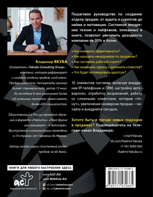 Владимир Якуба предлагает пошаговую инструкцию, позволяющую за два месяца оптимизировать воронку продаж, повысить конверсию, мотивировать сотрудников, наладить контроль, внедрить автоматизированные системы, создать продающие скрипты, привлечь новых клиентов, удержать существующих, вернуть бывших.