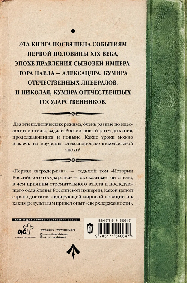 "Первая сверхдержава" — седьмой том "Истории Российского государства" — рассказывает читателю, в чем причины стремительного взлета и последующего ослабления Российской империи, какой ценой страна достигла лидирующей мировой позиции и к каким результатам привел опыт "сверхдержавности".