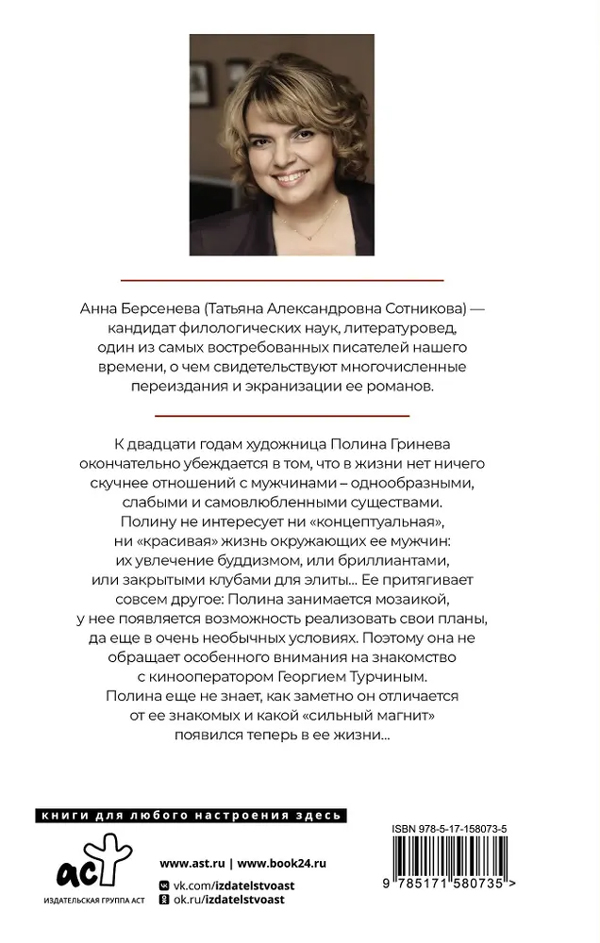 Полина Гринева – художник-мозаичист. Линии и краски для нее важнее, чем сентенции и слова; искусство – интереснее, чем отношения с мужчинами, существами примитивными и самовлюбленными; жизнь простая, полная трудов и вдохновений, – значимее, чем модная тусовка, элитные клубы и роскошь.