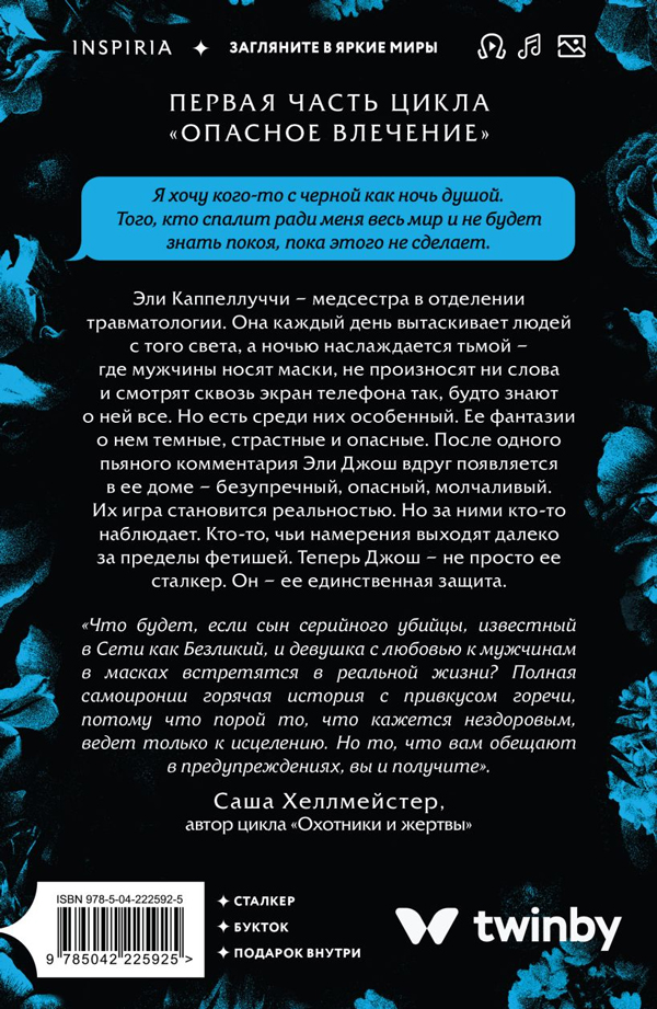 «Что будет, если сын серийного убийцы, известный в сети как Безликий, и девушка с любовью к мужчинам в масках встретятся в реальной жизни? Полная самоиронии горячая история с привкусом горечи, потому что порой то, что кажется нездоровым, ведет только к исцелению. Но то, что вам обещают в предупреждениях, вы и получите». — Саша Хеллмейстер, автор цикла «Охотники и жертвы»