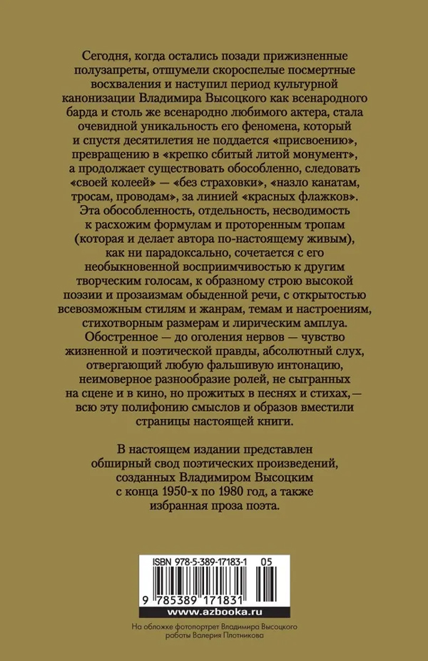 Сегодня, когда остались позади прижизненные полузапреты, отшумели скороспелые посмертные восхваления и наступил период культурной канонизации Владимира Высоцкого как всенародного барда и столь же всенародно любимого актера, стала очевидной уникальность его феномена, который и спустя десятилетия не поддается «присвоению», превращению в «крепко сбитый литой монумент», а продолжает существовать обособленно, следовать «своей колеей» – «без страховки», «назло канатам, тросам, проводам», за линией «красных флажков». Эта обособленность, отдельность, несводимость к расхожим формулам и проторенным тропам (которая и делает автора по-настоящему живым), как ни парадоксально, сочетается с его необыкновенной восприимчивостью к другим творческим голосам, к образному строю высокой поэзии и прозаизмам обыденной речи, с открытостью всевозможным стилям и жанрам, темам и настроениям, стихотворным размерам и лирическим амплуа. Обостренное – до оголения нервов – чувство жизненной и поэтической правды, абсолютный слух, отвергающий любую фальшивую интонацию, неимоверное разнообразие ролей, не сыгранных на сцене и в кино, но прожитых в песнях и стихах, – всю эту полифонию смыслов и образов вместили страницы настоящей книги.