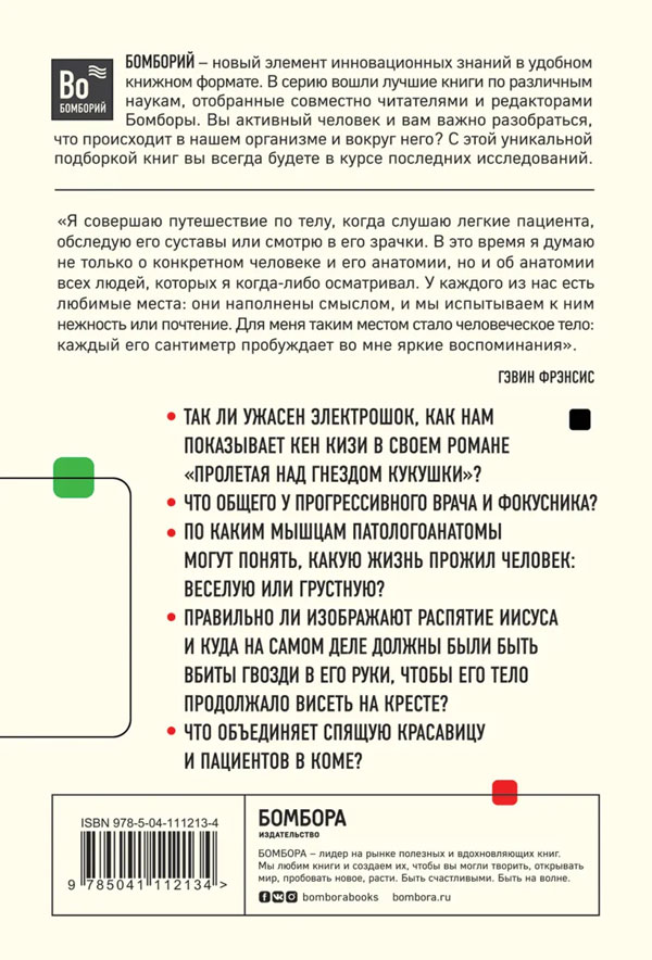 Что вам известно о человеческом теле? Вы хорошо разбираетесь в анатомии? Даже если это так, книга Гэвина Фрэнсиса откроет еще несколько неожиданных тайн, связанных с вашим организмом. Этот шотландский врач и писатель предлагает совершить настоящее путешествие по организму человека. Перемещаясь сверху вниз, от головы к стопам, делая остановку внутри самых разных частей тела, автор рассказывает интересные случаи из собственной практики и проводит забавные аналогии с историческим или литературным персонажем/явлением, а также рассказывает о том, насколько по-разному могут пациенты относиться к той или иной проблеме здоровья.