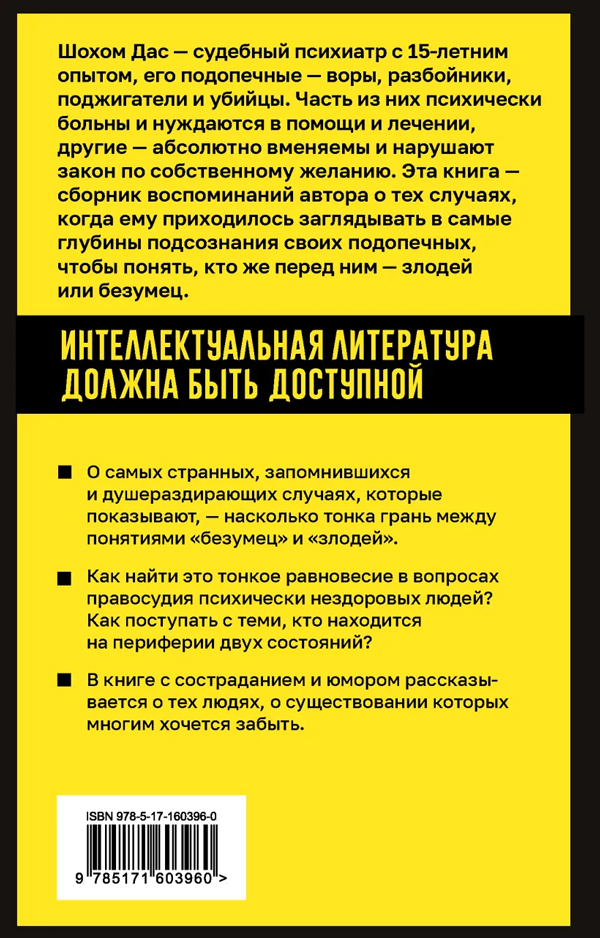 Шохом Дас – судебный психиатр с 15-летним опытом, его подопечные – воры, разбойники, поджигатели и убийцы. Часть из них психически больны и нуждаются в помощи и лечении, другие – абсолютно вменяемы и нарушают закон по собственному желанию. Эта книга – сборник воспоминаний автора о тех случаях, когда ему приходилось заглядывать в самые глубины подсознания своих подопечных, чтобы понять, кто же перед ним – “злодей” или “безумец”.
