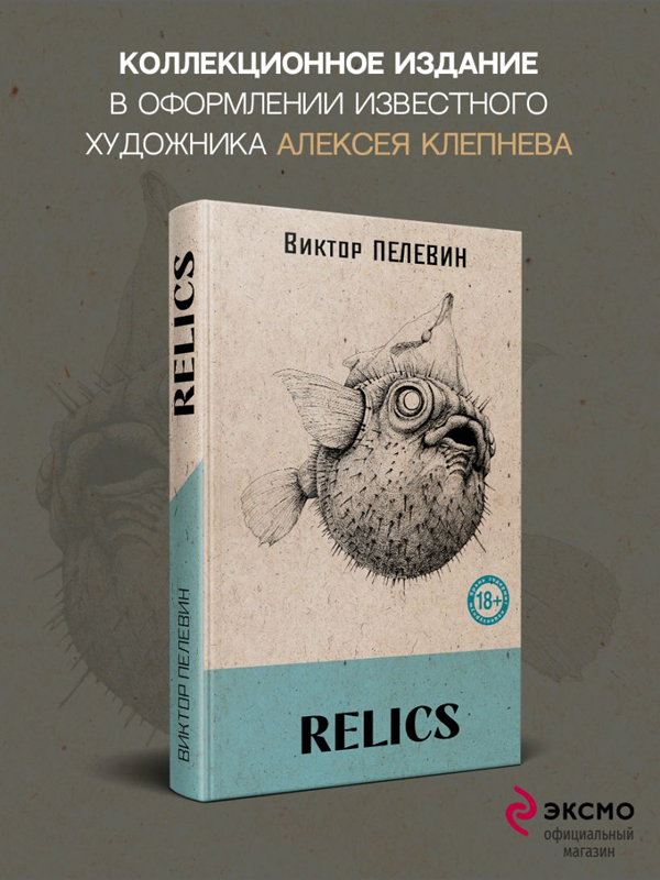 Книга Виктора Пелевина «Relics» со стикерпаком внутри.