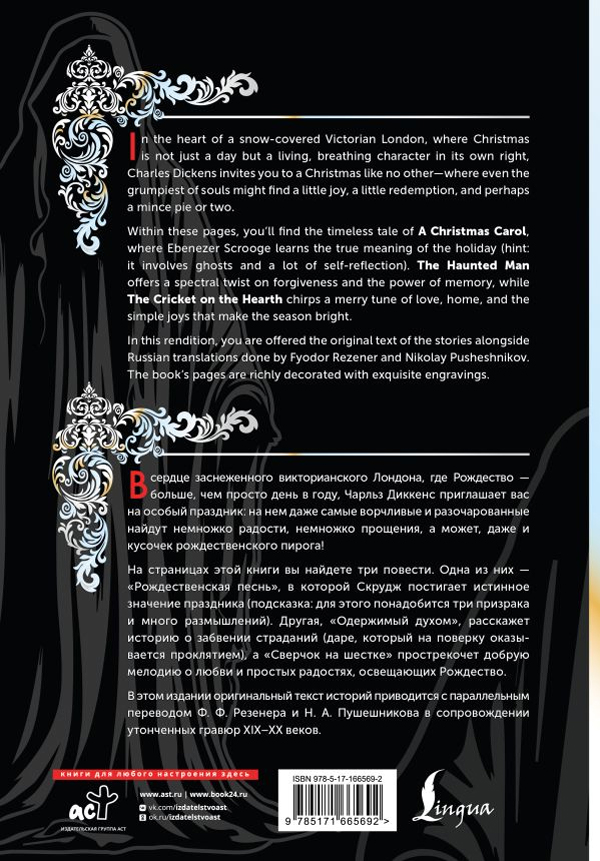 "Рождественская песнь в прозе" — его основа: мрачный Скрудж, варящийся в собственном соку, внезапно открывает для себя радость щедрости и любви. "Сверчок на шестке" — хрустящий рождественский крекер, наполненный домашним уютом и семейным счастьем, а "Одержимый духом" — пикантное угощение с привкусом тайн и прощения, оставляющее долгое и теплое послевкусие.
