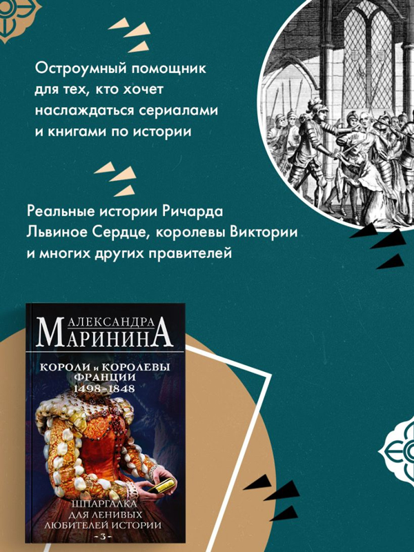 Новая историческая «шпаргалка» от Александры Марининой. На этот раз — французская. Париж, Версаль, блистательные короли, дерзкие королевы, изящные фрейлины и смелые мушкетёры… Ну кто из нас с детства не был очарован Францией и её историей! C особым «марининским» юмором в книге рассказывается история французских королей от Отца народа Людовика Двенадцатого до Луи-Филиппа Первого. Вы узнаете, что это были за люди, с какими талантами и недостатками, какими надеждами и мечтами они жили.