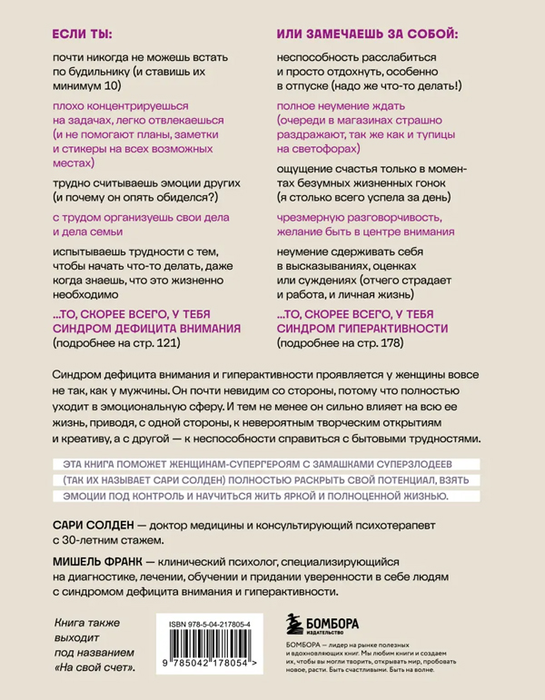 Два этих состояния — полярные полюса одного и того же — особенностей развития мозга. Они не являются заболеванием в полной мере этого слова, но изрядно портят нам жизнь. Во всем мире их называют СДВГ, а в России — плохим характером. Эта книга поможет разобраться, почему вы такая, какая есть. И научит справляться с трудностями, которые неизбежно сопровождают вас. Методики, разработанные авторами, способны организовать людей с дефицитом внимания и притормозить гиперактивных персонажей. А еще вас ждут десятки тестов для определения своего состояния и самоконтроля после прохождения программ реабилитации.