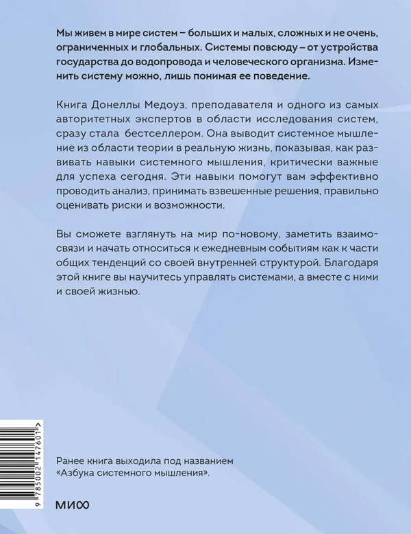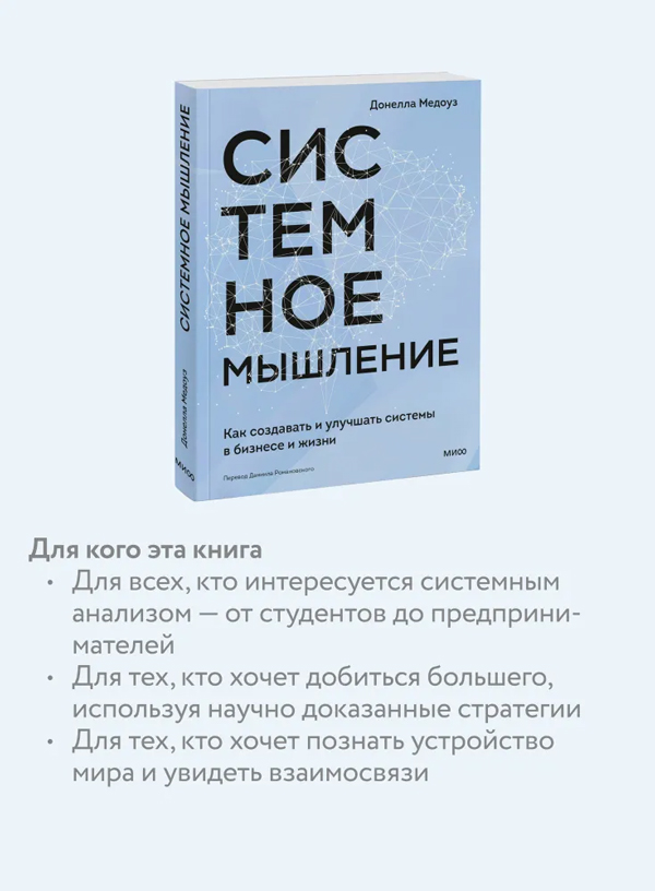 У этой книги удивительная история: Донелла Медоуз написала ее еще в 1990-х, но так и не отдала в печать. Ее труд долгое время распространялся неофициально, а после издания стал бестселлером — настолько точным и проницательным оказался. Потому что есть вещи, которые не меняются. Работа систем — одна из них.