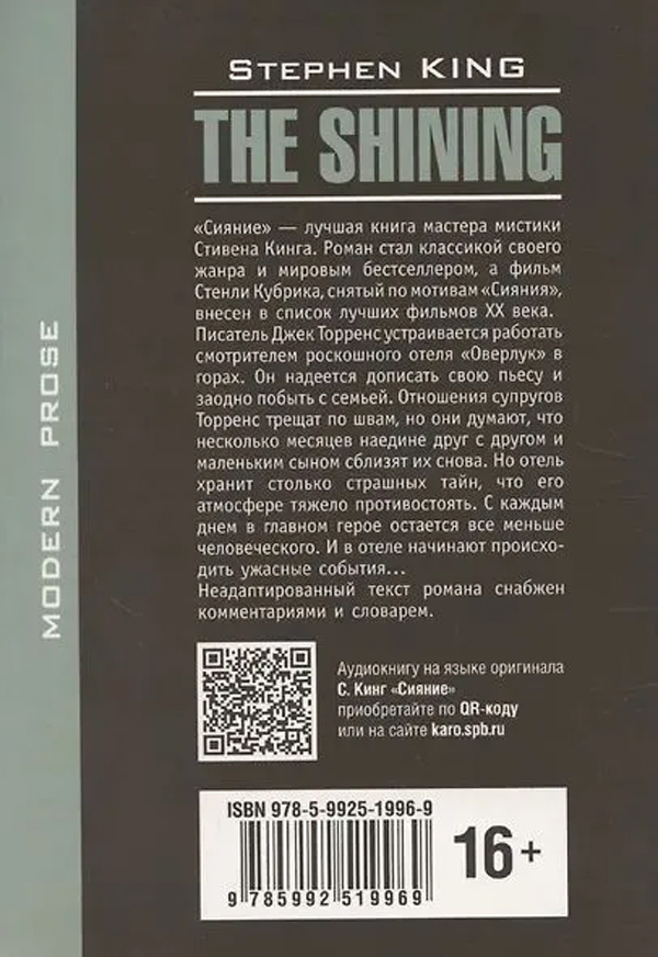 "Сияние" - лучшая книга мастера мистики Стивена Кинга. Роман стал классикой своего жанра и мировым бестселлером, а фильм Стенли Кубрика, снятый по мотивам "Сияния", внесен в список лучших фильмов XX века.