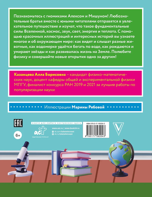 Познакомьтесь с гномиками Алексом и Мишуном! Любознательные братья вместе с юными читателями отправятся в увлекательное путешествие и изучат, что такое фундаментальные силы Вселенной, космос, звук, свет, энергия и теплота. С помощью красочных иллюстраций и интересных историй вы узнаете многое и об окружающем мире: как видят и слышат разные животные, как водомерке удаётся бегать по воде, как рождаются и умирают звёзды и как развивалась жизнь на Земле. Полюбите физику и совершайте новые открытия одно за другим!