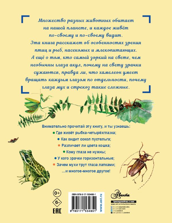 Книга энтомолога, доктора биологических наук, популяризатора науки для детей Виталия Танасийчука "Сколько глаз у стрекозы?" расскажет о том, как видят разные звери, птицы, рыбы и насекомые. Прочти её, и ты узнаешь, у кого глаза на ножках, кто из птиц самый зоркий, как охотится хамелеон, кому глаза вообще не нужны, различает ли цвет кошка и многое другое.