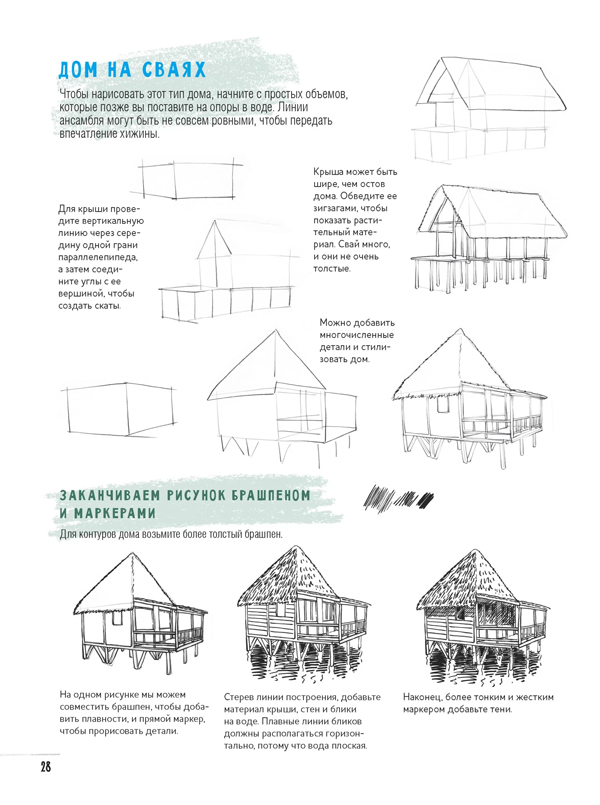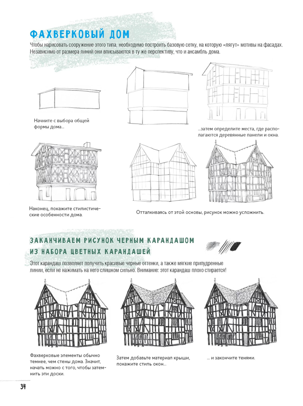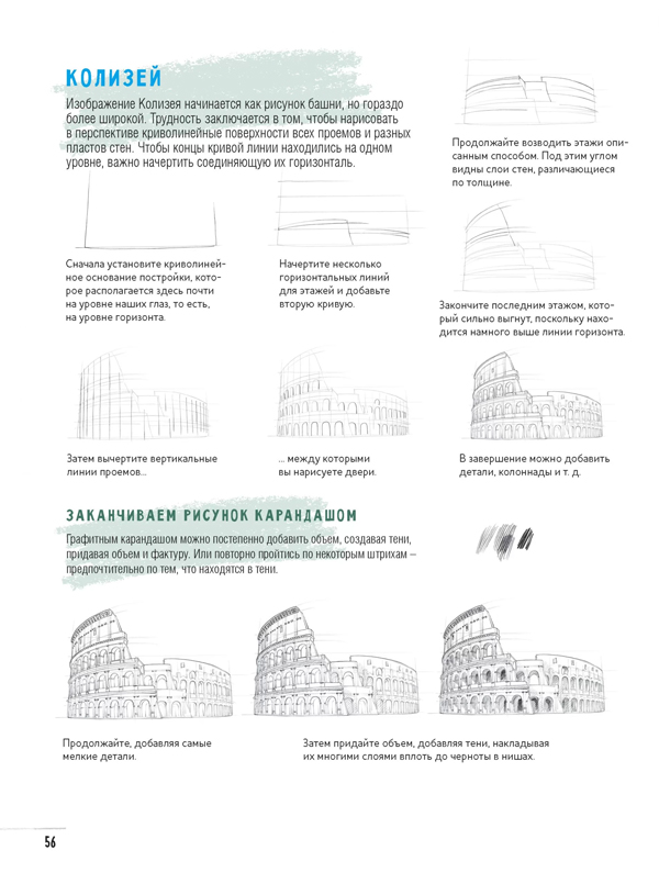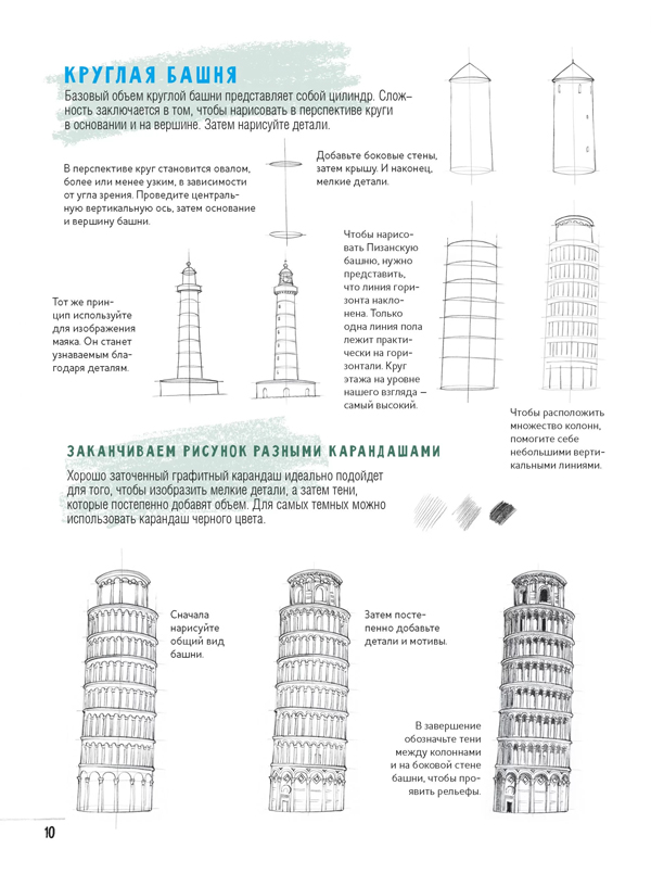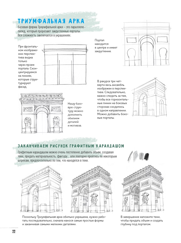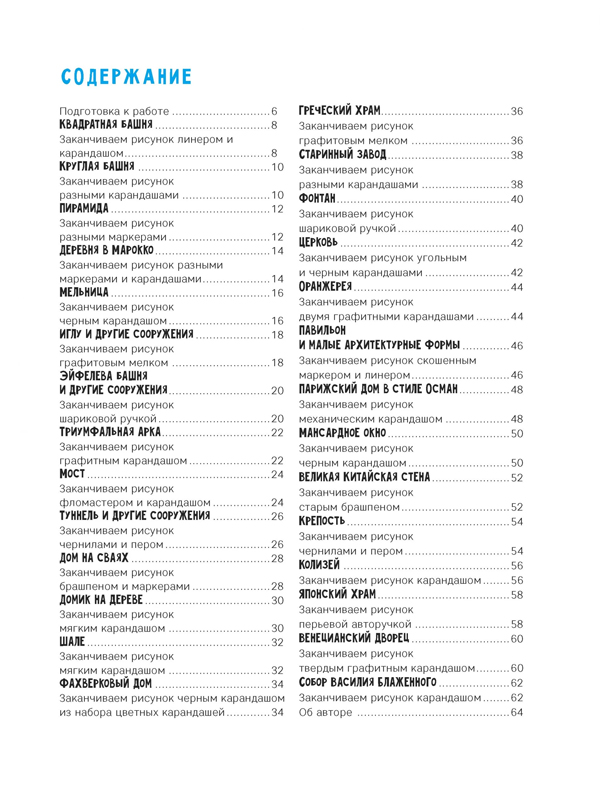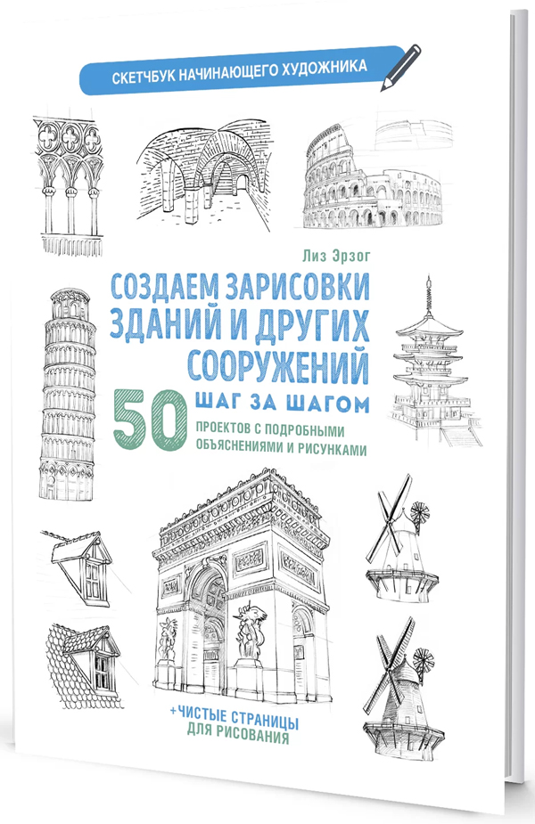 В этом скетчбуке вас ждут мастер-классы по рисованию зданий и построек: домов, дворцов, башен, пирамид, замков и т. д. Для простоты и наглядности автор разбивает каждое строение на простые формы и объемы, а затем с помощью различных приемов светотени и перспективы, а также разнообразных принадлежностей, дополняет деталями базовую структуру, превращая на наших глазах несколько объемных геометрических форм, к примеру, собор Василия Блаженного! Благодаря тому, что все уроки разбиты на 2–5 простых этапов, вы легко выделите главные моменты. Просто следуйте указаниям!