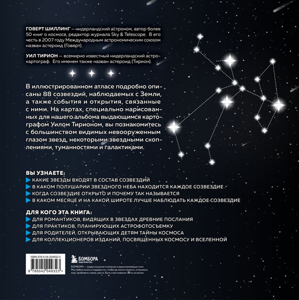 Звёздный гид от легендарных авторов: писателя-астронома Говерта Шиллинга и картографа Уила Тириона — создателя самых точных звёздных карт XX века. Яркие, чёткие иллюстрации и продуманная структура позволяют легко ориентироваться среди 88 созвездий. Лаконичные описания и интересные факты о событиях, происходивших в зоне каждого созвездия, пробуждают истинное любопытство и интерес к исследованию темы космоса.