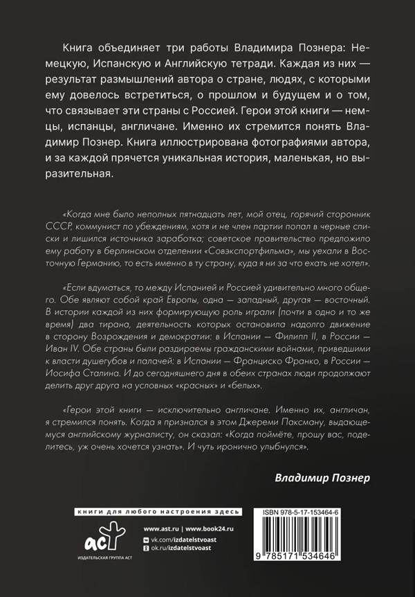 Владимир Владимирович Познер – мэтр российской журналистики. За его плечами годы продуктивной работы на телевидении (телеведущий авторской телевизионной программы-интервью "Познер" на "Первом канале") и несколько книг. Его книги "Немецкая тетрадь", "Английская тетрадь" и "Испанская тетрадь" на протяжении нескольких месяцев держалась во многих российских рейтингах.