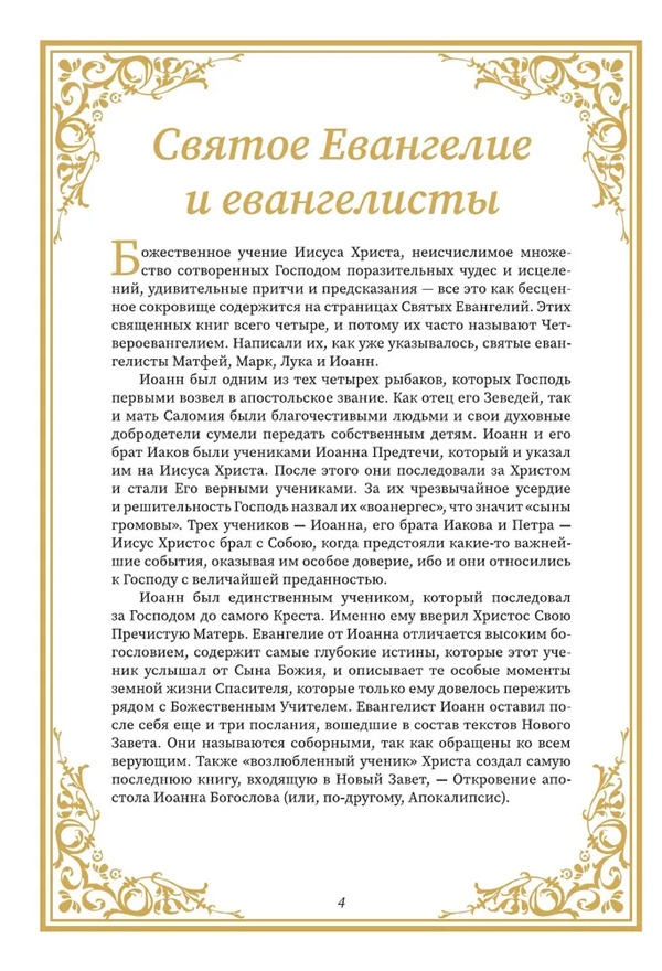 Святое Евангелие — главная книга христианства. Именно оно несет благую весть о пришествии Сына Божия Иисуса Христа и спасении Им человеческого рода от греха и смерти. Это больше, чем книга, это — обращенный к человеку зов Бога. Неслучайно Святое Евангелие всегда находится в главной части православного храма — в алтаре, на престоле, символизируя тем самым незримое присутствие здесь Спасителя.