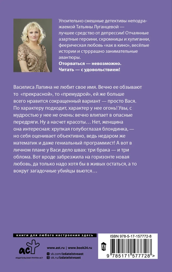 Василиса Лапина не любит свое имя. Вечно ее обзывают то "прекрасной", то "премудрой", ей же больше всего нравится сокращенный вариант – просто Вася. По характеру подходит, характер у нее огонь! Увы, с мудростью у нее не очень: вечно влипает в опасные передряги. Ну а насчет красоты… Нет, женщина она интересная: хрупкая голубоглазая блондинка, – но себя оценивает объективно, ведь недаром же математик и даже гениальный программист! А вот в личном плане у Васи дело швах: три брака – и три облома.
