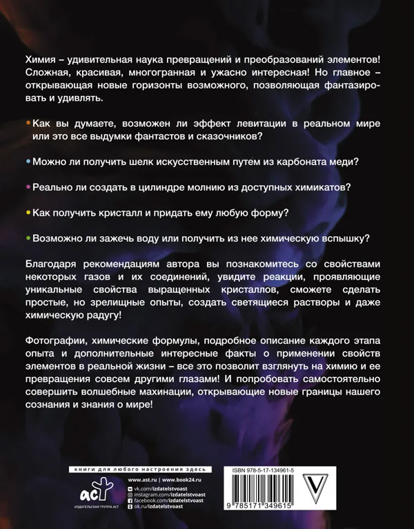 Фотографии, химические формулы, подробное описание каждого этапа опыта и дополнительные интересные факты о применении свойств элементов в реальной жизни – все это позволит взглянуть на химию и ее превращения совсем другими глазами! И попробовать самостоятельно совершить волшебные махинации, открывающие новые границы нашего сознания и знания о мире!