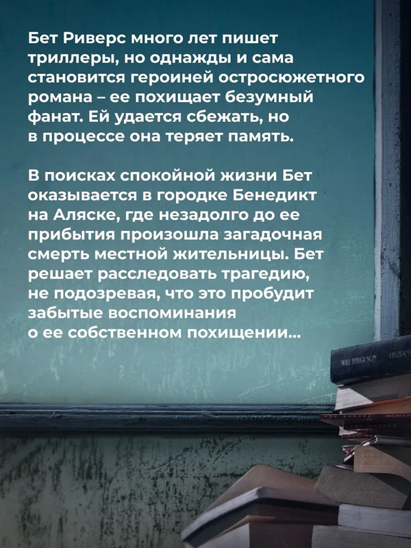 В поисках спокойствия писательница оказывается в городе Бенедикт на Аляске, однако и там не обходится без происшествий: незадолго до ее прибытия население и так небольшого городка сократилось на одного человека. Смерть Линды Рафферти признали самоубийством, хотя даже сам шериф в это не верит. Бет ждет, когда поймают ее сталкера, и решает погрузиться в расследование смерти Линды, но это дело пробуждает ее воспоминания о собственном похищении…