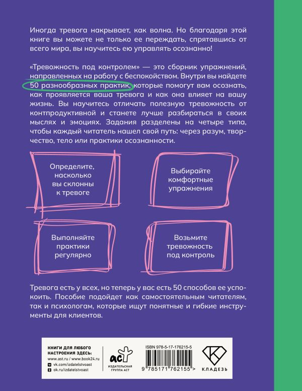"Тревожность под контролем" — это сборник упражнений, направленных на работу с беспокойством. Внутри вы найдете 50 разнообразных практик, которые помогут вам осознать, как проявляется ваша тревога и как она влияет на вашу жизнь. Вы научитесь отличать полезную тревожность от контпродуктивной и станете лучше разбираться в своих мыслях и эмоциях.
