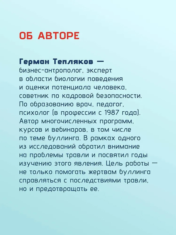 Герман Тепляков — бизнес-антрополог, эксперт в области биологии поведения и оценки потенциала человека, советник по кадровой безопасности. По образованию врач, педагог, психолог (в профессии с 1987 года). Автор многочисленных программ, курсов и вебинаров, в том числе по теме буллинга. В рамках исследования "Выявление групп риска по зависимому и суицидальному поведению среди детей и подростков" обратил внимание на проблемы травли и посвятил годы изучению этого явления. Цель работы — не только помогать жертвам буллинга справляться с последствиями травли, но и предотвращать ее.