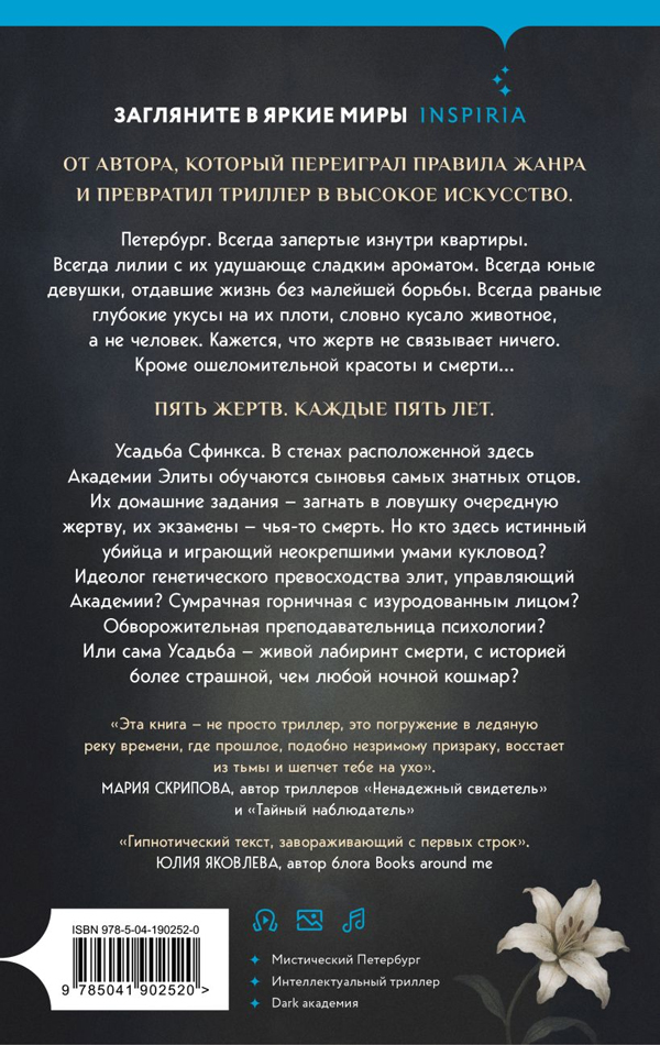 Усадьба Сфинкса. В расположенной ее стенах Академии Элиты обучаются сыновья самых знатных отцов. Их домашние задания — загнать в ловушку очередную жертву, их экзамены — чья-то смерть. Но кто здесь истинный убийца и играющий неокрепшими умами кукловод? Идеолог генетического превосходства элит, управляющий Академии? Сумрачная горничная с изуродованным лицом? Обворожительная преподавательница психологии? Или сама Усадьба — живой лабиринт смерти, с историей, более страшной, чем любой ночной кошмар?