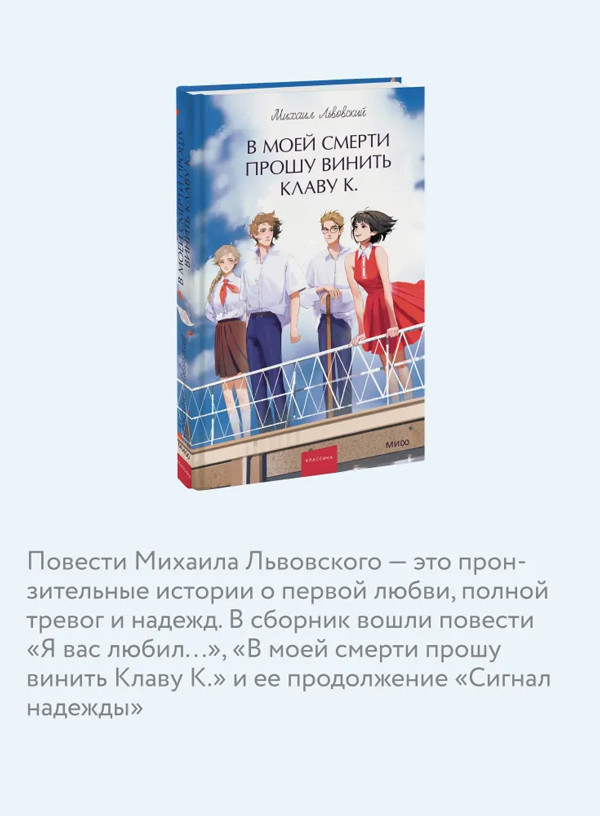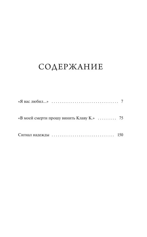 В сборник вошли повести "Я вас любил...", "В моей смерти прошу винить Клаву К." и ее продолжение "Сигнал надежды".