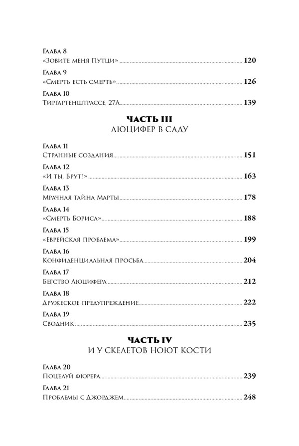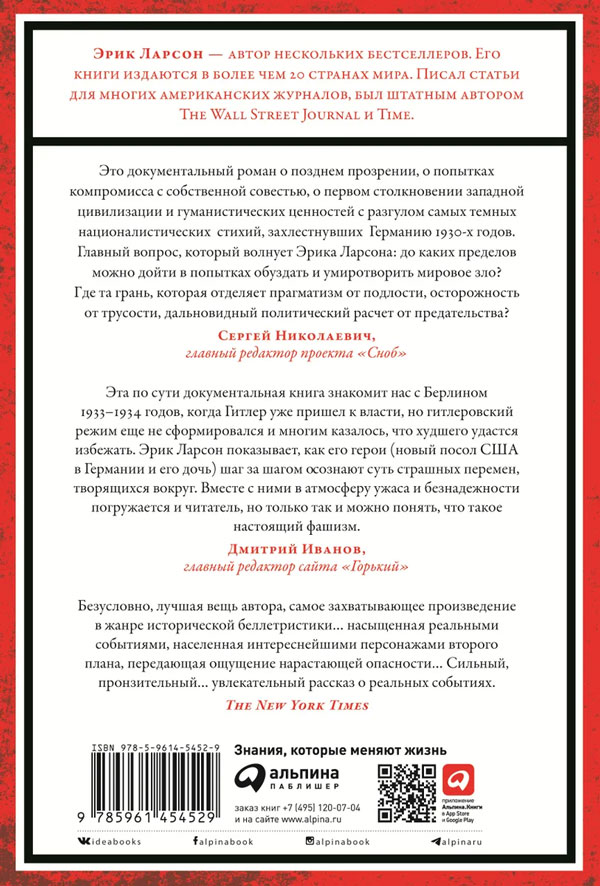Известный журналист и автор нескольких бестселлеров Эрик Ларсон предлагает читателю погрузиться в атмосферу Берлина 30‑х гг. XX в., в переломный период новейшей истории Германии — от назначения Гитлера на пост канцлера до узурпации им власти и превращения страны в «сад чудовищ» — диктатуру, активно готовящуюся к войне.