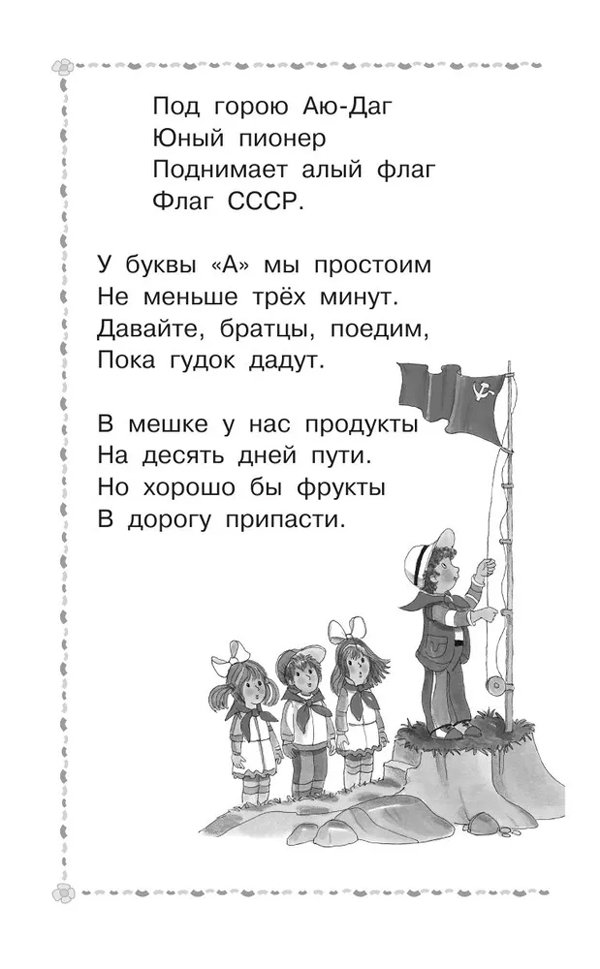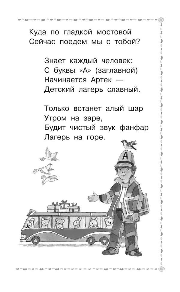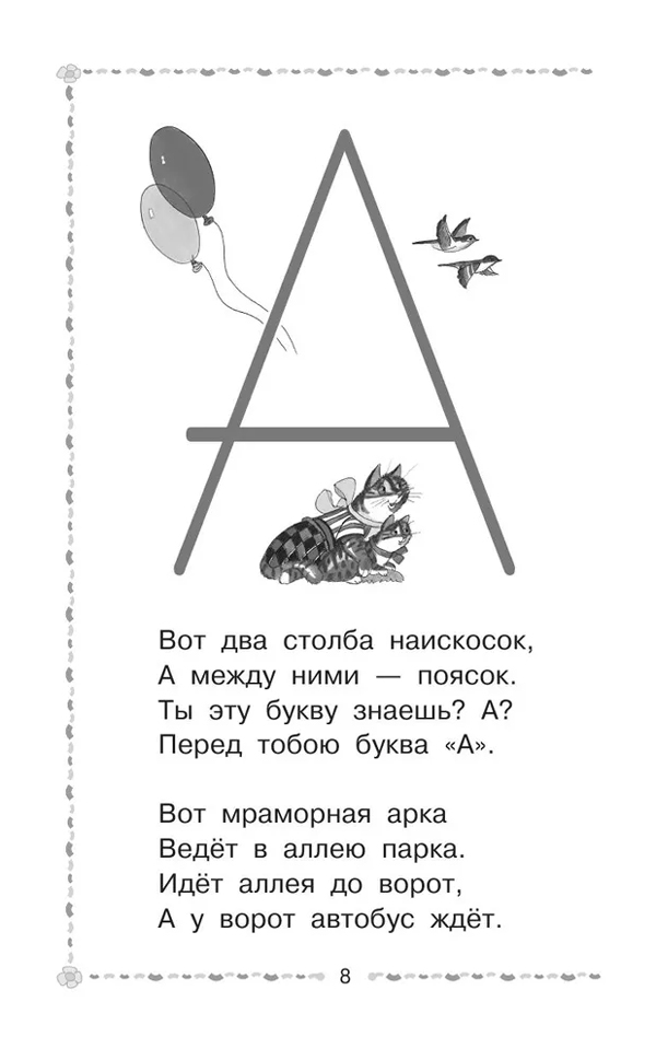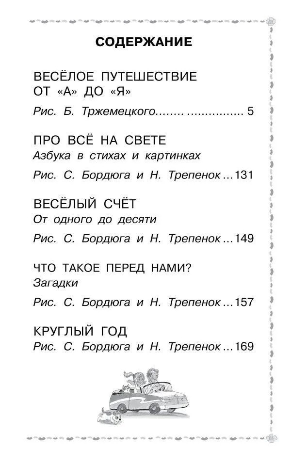 В книгу вошли циклы: «Весёлое путешествие от ‟А„ до ‟Я„», «Про всё на свете. Азбука в стихах и картинках», «Весёлый счёт. От одного до десяти», «Что такое перед нами? Загадки», «Круглый год».