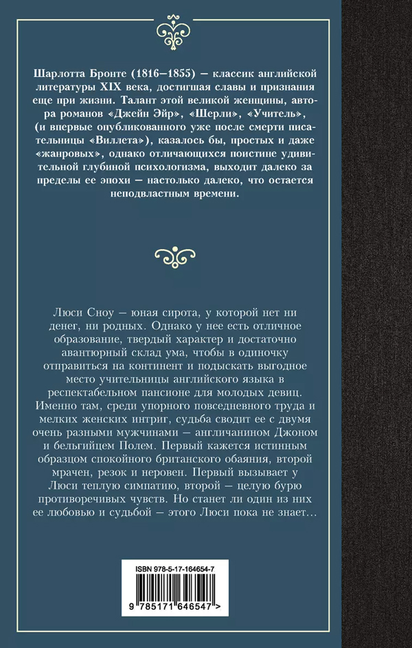 Люси Сноу – юная сирота, у которой нет ни денег, ни родных. Однако у нее есть отличное образование, твердый характер и достаточно авантюрный склад ума, чтобы в одиночку отправиться на континент и подыскать выгодное место учительницы английского языка в респектабельном пансионе для молодых девиц.