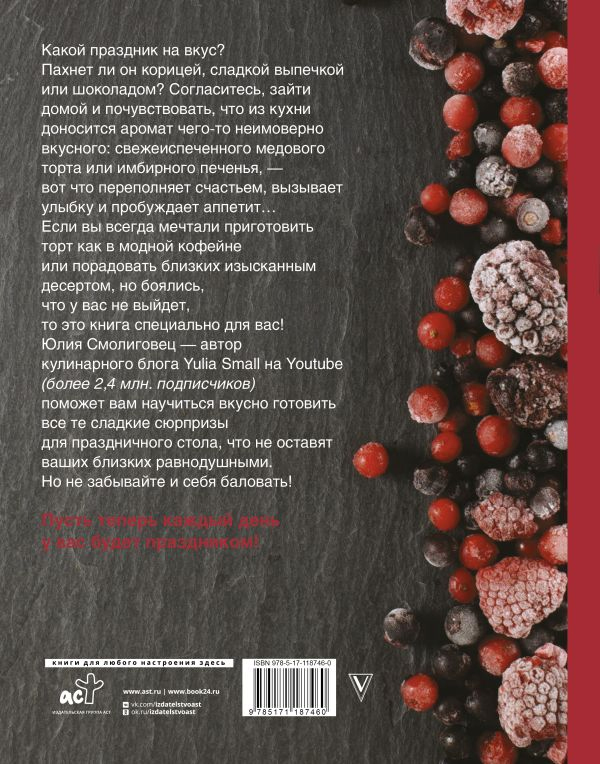 Если вы всегда мечтали приготовить торт как в модной кофейне или порадовать близких изысканным десертом, но боялись, что у вас не выйдет, то это книга специально для вас! Юлия Смолиговец — автор кулинарного блога Yulia Small на Youtube (более 1,3 млн. подписчиков) поможет вам научиться вкусно готовить все те сладкие сюрпризы для праздничного стола, что не оставят ваших близких равнодушными. Но не забывайте и себя баловать!