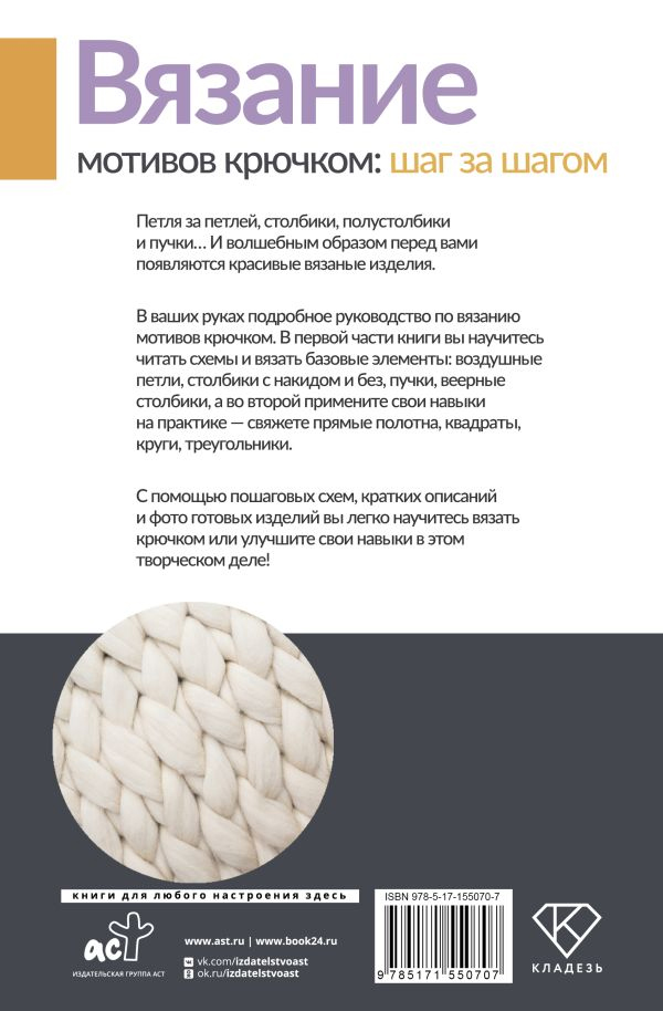 Шаг за шагом вы научитесь читать схемы и вязать базовые элементы: воздушные петли, столбики с накидом и без, пучки, веерные столбики. А затем свяжите красивые мотивы: прямые полотна, квадраты, круги, треугольники, из которых можно создать элементы одежды и украшения для дома.