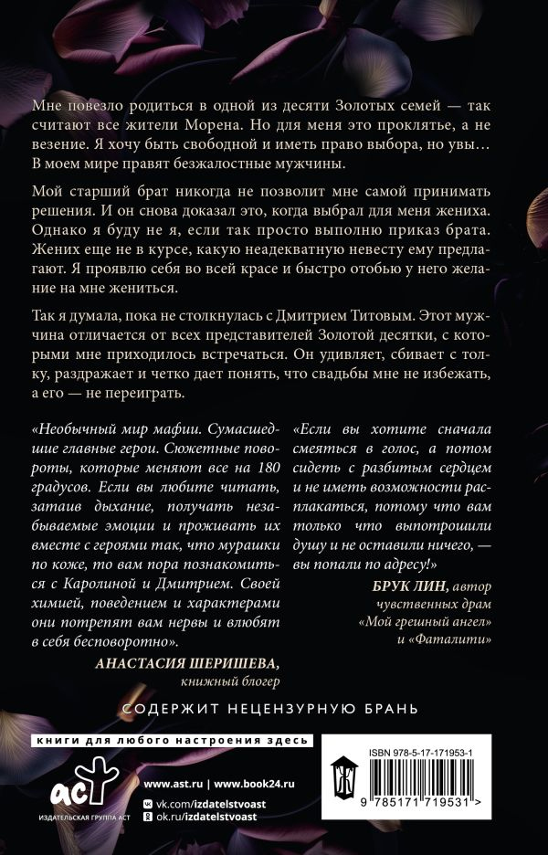 Так я думала, пока не столкнулась с Дмитрием Титовым. Этот мужчина отличается от всех представителей Золотой десятки, с которыми мне приходилось встречаться. Он удивляет, сбивает с толку, раздражает и четко дает понять, что свадьбы мне не избежать, а его — не переиграть.