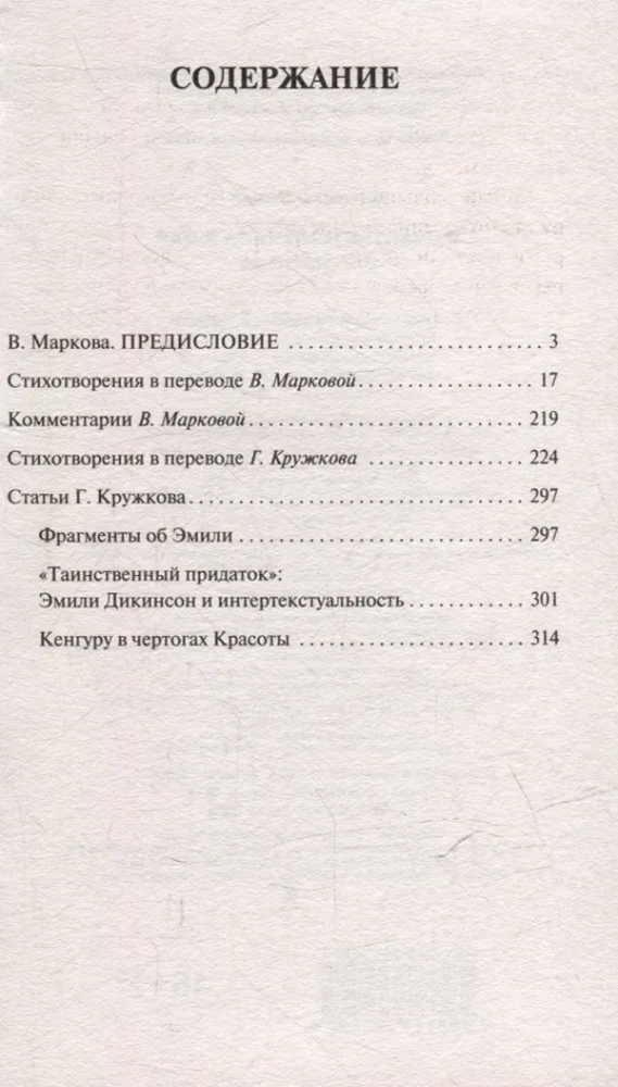 В это издание вошли стихи в переводах Веры Марковой и Григория Кружкова. И как писал Г. Кружков, стихи Дикинсон заслуживают того, чтобы читать их сплошь, удивляться и делать все новые открытия.