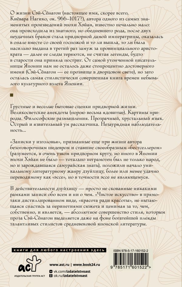 В действительности «дзуйхицу» — просто не скованные никакими рамками записи обо всем и ни о чем. «Чистое искусство» в прямо-таки дистиллированном виде, «красота ради красоты», не пытающаяся спастись за перипетиями сюжета и ценимая за то, чем, собственно, и является, — абсолютное совершенство стиля, которым проза Сэй-Сёнагон выделяется даже на фоне богатейшей плеяды талантливых стилистов средневековой японской литературы.