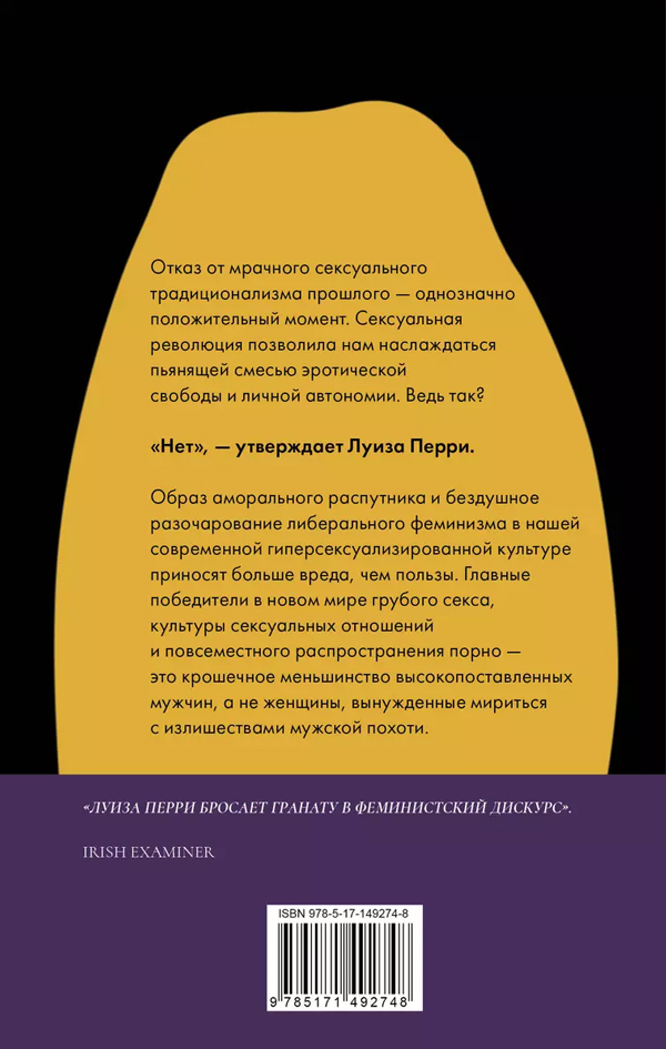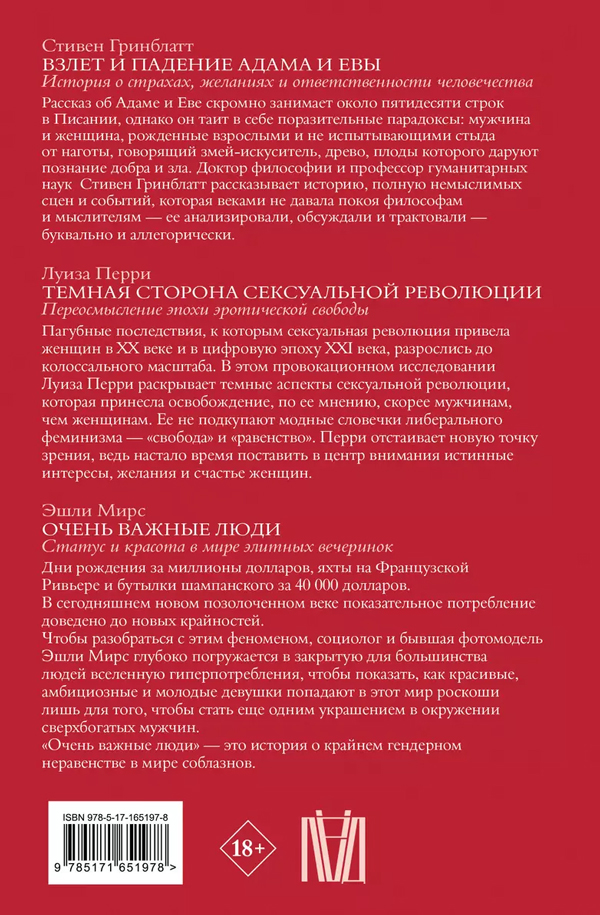 В этом провокционном исследовании Луиза Перри раскрывает темные аспекты сексуальной революции, которая принесла освобождение, по ее мнению, скорее мужчинам, чем женщинам. Ее не подкупают модные словечки либерального феминизма — "свобода" и "равенство". Перри отстаивает новую точку зрения, ведь настало время поставить в центр внимания истинные интересы, желания и счастье женщин.