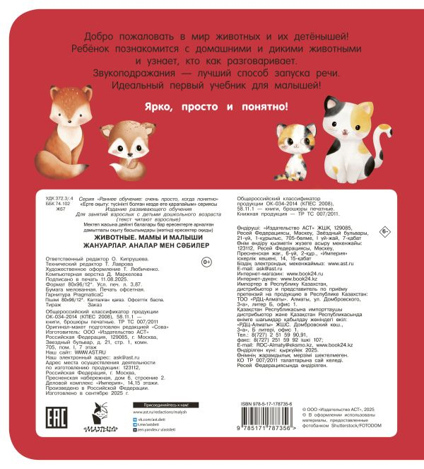 "Животные. Мамы и малыши" — это первая книжка в картинках для самых маленьких. На страницах книги дети познакомятся с кошкой и котёнком, собакой и щенком, коровой и телёнком и другими животными. Каждая картинка сопровождается крупной подписью и звукоподражанием — способствуют запуску речи. А качественная мелованная бумага и закруглённые углы страниц делают книгу прочной и безопасной — она не порвётся и не помнётся, а ребёнок не порежется!