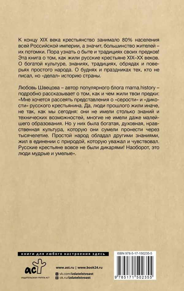 Любовь Швецова – автор популярного блога mama.history в книге "Быт и традиции русского крестьянства" подробно рассказывает о том, как и чем жили ваши предки: "Мне хочется рассеять представления о "серости" и "дикости" русского крестьянина. Да, люди прошлого жили иначе, не так, как мы сегодня: они не имели столько знаний и технических возможностей, многие не имели даже малейшего образования. Но у них была богатая, духовная, нравственная культура, которую они сумели пронести через тысячелетие. Простой народ обладал другими знаниями, жил в единении с природой, которую уважал и чувствовал. Русские крестьяне вовсе не были дикарями! Наоборот – это люди мудрые и умелые".