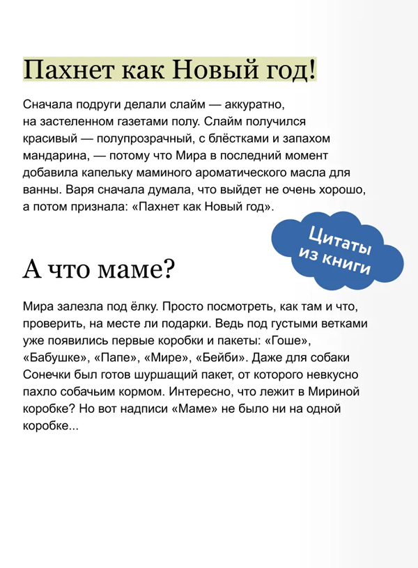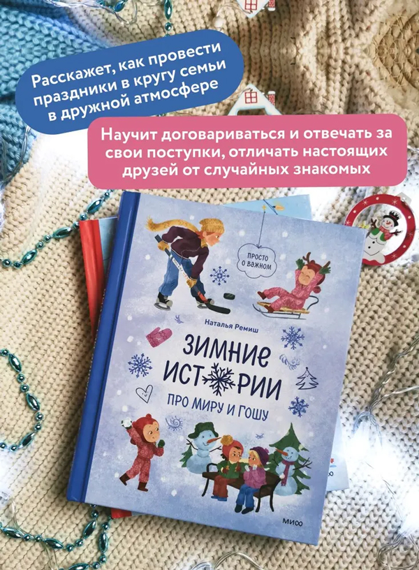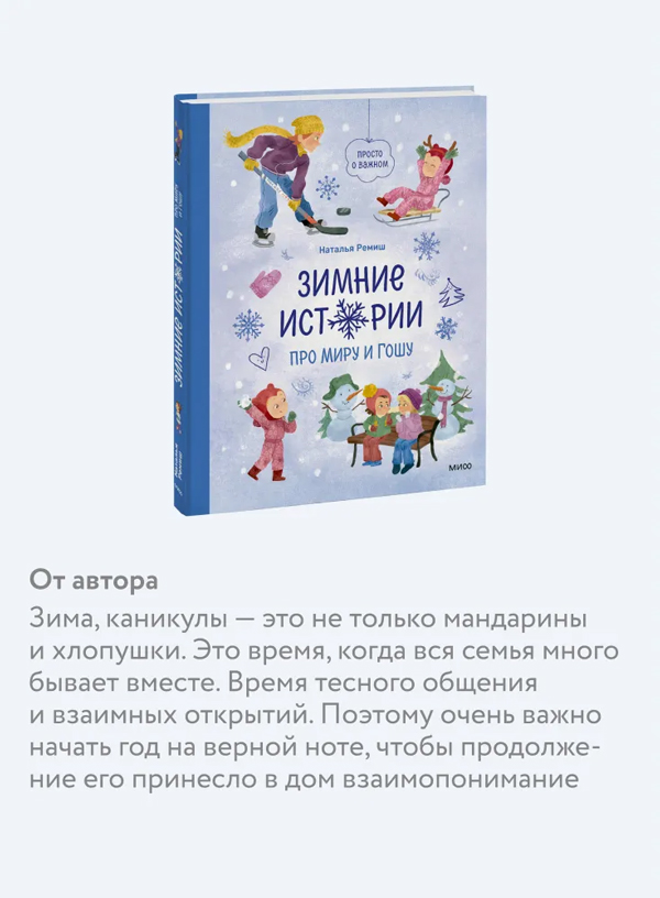 Вместе с Мирой, Гошей и Бейби отправляйтесь навстречу зимним приключениям. Наденьте коньки, достаньте санки и клюшки, займитесь любимым хобби или просто посмотрите в окно, наблюдая, как падает снег. Истории Натальи Ремиш помогут детям и взрослым по‑новому взглянуть на повседневные ситуации и лучше понять друг друга.